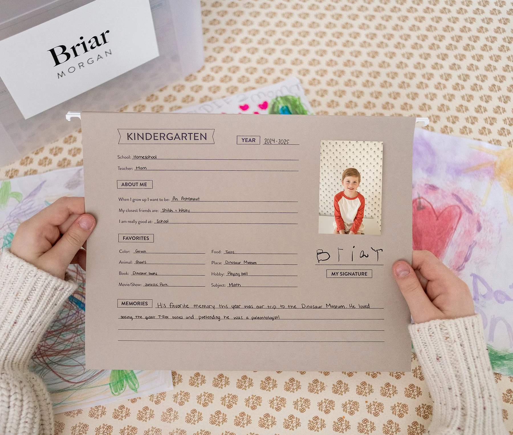 A space on the cover of each file folder to conduct an annual interview with your child and write their answers